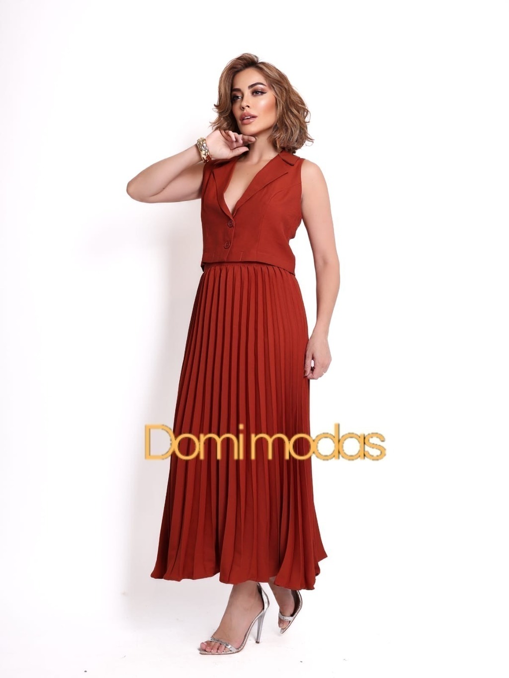 Domi Modas Conjunto Feminino Saia Plissada Camponesa e Colete Tecido Amarante 86600